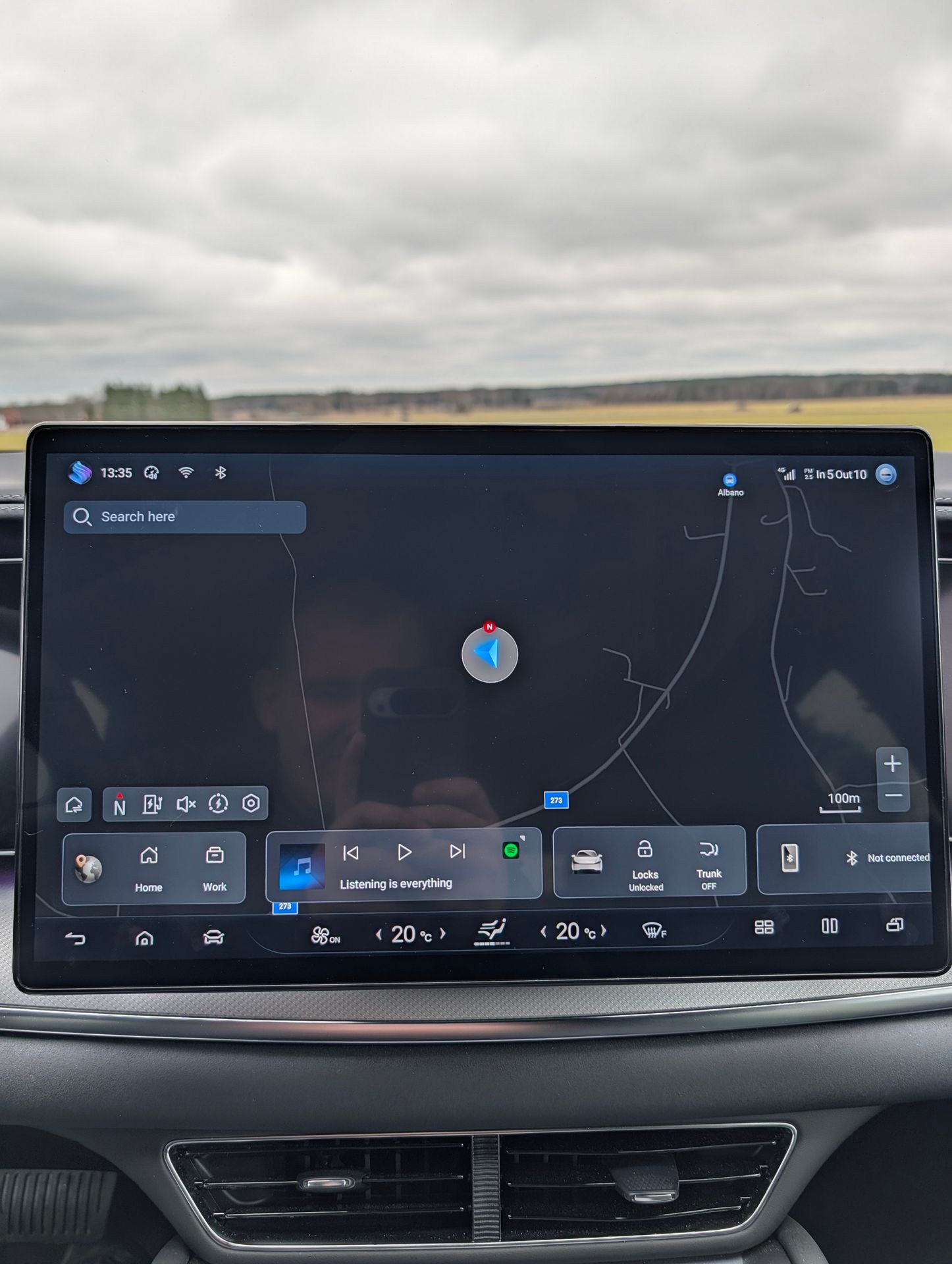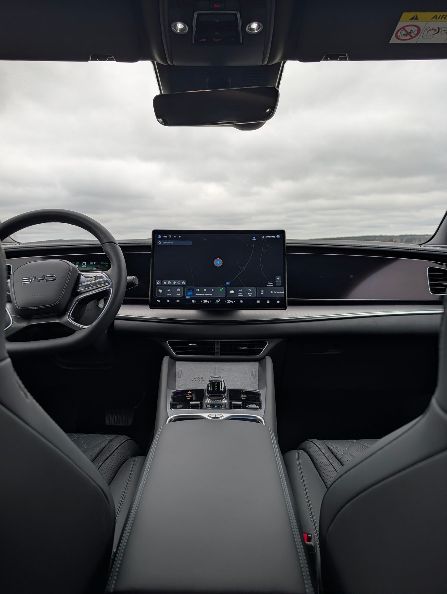 Mittenskärmen är roterbar. Ja, du hörde rätt. För via en ikon i skärmen så kan du rotera den från stående till liggande. Eller tvärtom. Jag finner personligen skärmen alldeles för smal för att ha den som stående och därav har jag skärmen alltid i format liggande. För att ha skärmen roterbar så måste man göra den mer kvadratisk i t ex 4:3 format istället för 16:9 eller något som den är nu. Menysystemet som skärmen kör är innehållsrik, men den är föråldrad jämfört med nyare elbilar från BYD har Android Automotive inbyggt. Det märks främst i ett begränsad apputbud och en navigator som är långt ifrån den bästa.