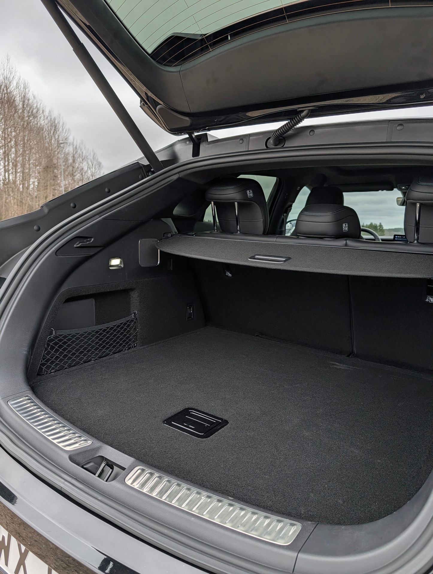 Men nu vidare till utrymmena. I fram möts vi av en frunk på 58 liter som jag finner är full tillräcklig i storlek. Den är heller inte inklädd då det är bar skrapplast och det är toppen för att hålla den ren ifrån smutsiga laddkablar. Enda som saknas är dräneringplugg. I bak hittar man ett bagageutrymme som är på 520 liter och har en nackdel att lasta högt då bakluckan sluttar samt att skidlucka saknas. Det kompenseras att det finns ett riktigt djupt fack under lastgolvet.