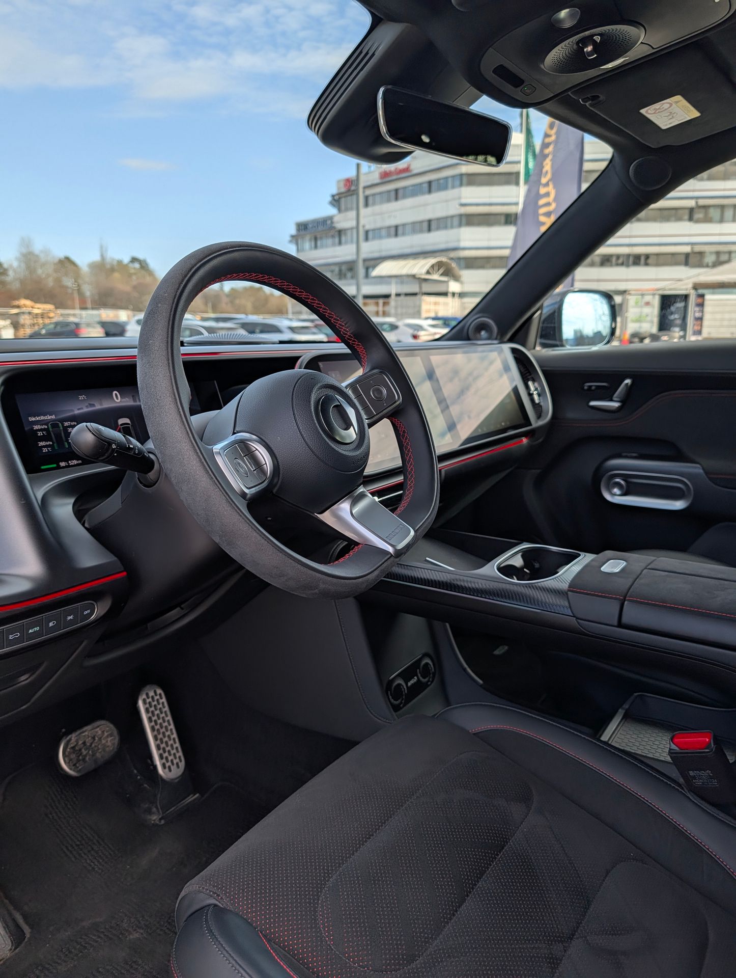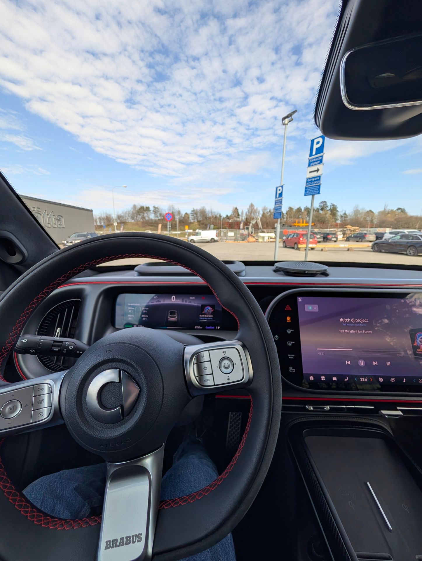 Förarassistenter har Smart #5 Brabus rätt många av faktiskt. Alltifrån självparkering samt styrassistent. Ska man diskutera styrassistenten så tycker jag att den håller sig innanför linjerna relativt bra i många sammanhang. Men rätt ofta så får bilen för sig att det är 80 km gräns på motorväg och farten saktas in. Det är rätt dumt. Jag saknar också att ratten inte är kapacitiv, vilket innebär att jag som förare måste rycka i ratten för att väcka styrassistenten. En annan nackdel är användarvänligheten för t ex självparkeringen som kräver många tryck för att aktivera den samt att byta mellan adaptiv farthållare och styrassistent kräver 2 tryck på rattknapp istället för enbart 1 många andra konkurrenter har.