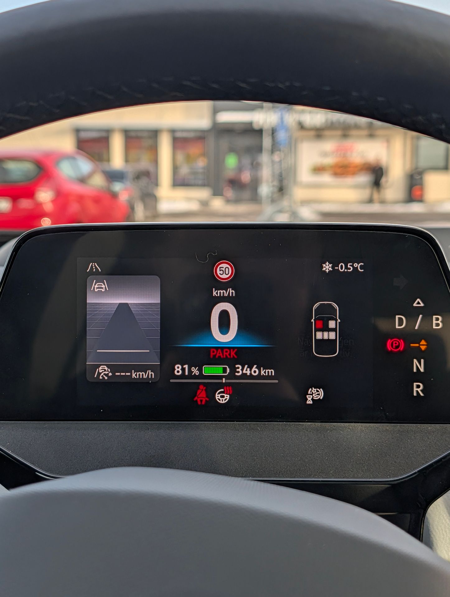 Mjukvaran som finns i Volkswagen ID.3 (och många andra elbilar byggd på MEB) känns helt ok. Inte toppmodern och kan upplevas som lite rörig, men den fyller sin funktion och känns pålitlig. Förarskärm finns också och den skvallrar mest om hur gammal ID.3 är i grunden. Skärmen som sitter nära föraren är liten, låg upplösning och som är fult integrerad på rattstången i en form liknande en stam med en avhuggen triangel på. Heads-Up-Displayen som min bil var utrustad med tycker jag om och känns relativt modern då den har "AR"-funktionalitet.