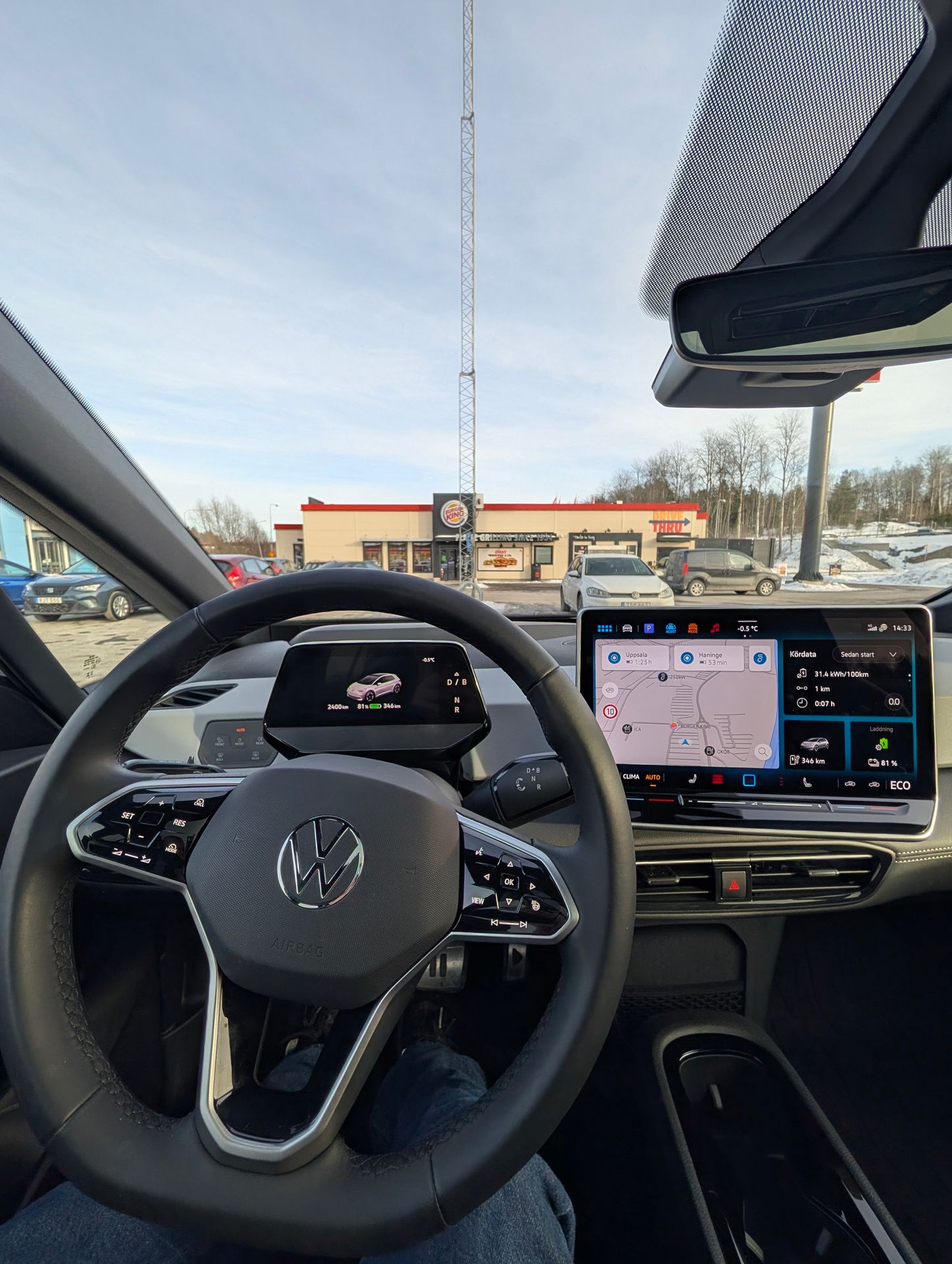 Den andra positiva saken är räckvidden. Jag har kommit över 40 mil på motorvägsfart när det har varit minusgrader ute och det är faktiskt rätt bra för att vara i denna storleksklass. Jag har varit med om flera dyrare elbilar som presterar sämre än denna så jag upplever ID.3 Pro S räckvidd som fullt godkänd.